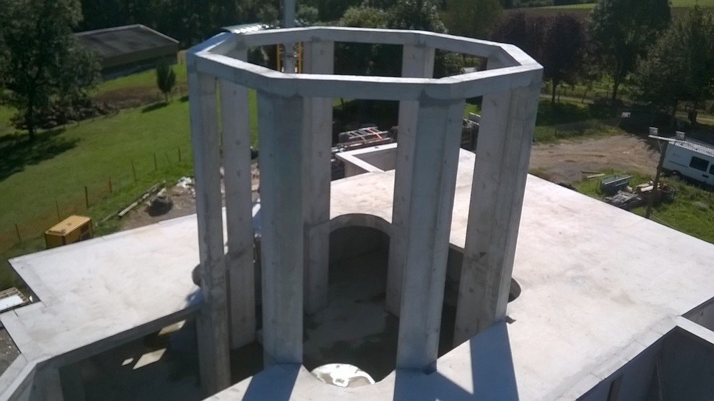 L’ossature en béton du nouveau catholicon est maintenant terminée. Ce squelette supportera la charge de l’étage supérieur de l’église et il constituera aussi l’ossature qui supportera les arcs caractéristiques des églises byzantines et les charpentes et murs en matériaux traditionnels des constructions typiques de Dordogne.